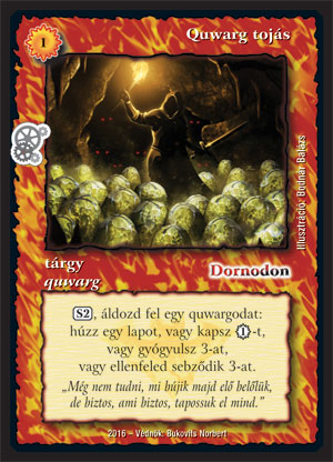 Quwarg tojás (7): ...ja persze, hát egy kis erőforrás! Szerencsére az is van, a Quwarg tojás, amivel gyönyörűen hasznosítani tudjuk a többi lap által termelt Nyomorult quwargokat. Körönként két azonnali lapot húzni nagyon erős képesség, nagyon szépen bepörgeti a decket a második körben - az pedig külön öröm, hogy Bilincs és Börtön ellen sem lesz blank.