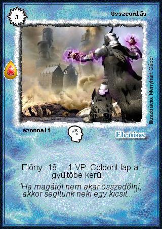Kiadás: Zu'lit kincse Gyakoriság: ritka Lapszín (isten): Elenios Típus: azonnali Szöveg: Előny: 18-: -1 VP. Célpont lap a gyűjtőbe kerül. Szinesítő szöveg: "Ha magától nem akar összedőlni, akkor segítünk neki egy kicsit..." Illusztráció: Menyhárt Gábor