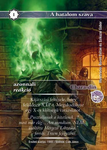 Szöveg: Közvetlenül azután játszhatod ki, hogy valaki megpróbált kijátszani egy varázslatot. Kijátszási feltétele, hogy feláldozd annyi ÉP-det, amennyi a célpont varázslat idézési költsége. A varázslat nem jön létre, csak a gyűjtőbe kerül.