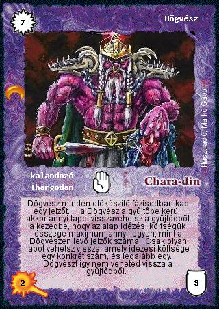 Szöveg: Dögvész minden előkészítő fázisodban kap egy jelzőt. Ha Dögvész a gyűjtőbe kerül, akkor annyi lapot visszavehetsz a gyűjtődből a kezedbe, hogy az alap idézési költségük összege maximum annyi legyen, mint a Dögvészen levő jelzők száma. Csak olyan lapot vehetsz vissza, amely idézési költsége egy konkrét szám, és legalább egy. Dögvészt így nem veheted vissza a gyűjtődből.