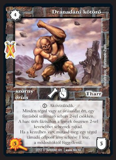Kiadás: Istenek viadala Gyakoriság: ritka Lapszín (isten): Tharr Típus: szörny Altípus: óriás Szöveg: 1_VP: Aktivizálódik. Minden téged vagy az óriásaidat ért sebzés 2-vel csökken. A harc ütés fázisában a lények összesen 2-vel kevesebbet sebeznek rajtad. Ha a kezedben van, mutasd meg: egy téged támadó célpont lény sebzése 1 lesz, a módosítóktól függetlenül. Illusztráció: Ruzsinszki Zsolt