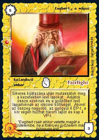 | (AK117) A kör végén kapok varázspontot, ha Ewgbert, a mágust kijátszom, és nekem nagyobb a lapjaim idézési költségeinek összege. A szöveg pontosan kimondja: „gyógyul 4 ÉP-t, a kör végén húzhat három lapot és kap 4 VP-t. Sokan a Niagren pálcáját (új) hozzák fel példaképpen, az azonban teljesen más eset. Ott VAGY a kör végén húzok két lapot, VAGY kapok három komponenst. A két rész vesszővel és vagy szóval van elválasztva, tehát a „kör végén” kitétel csak a laphúzásra vonatkozik.