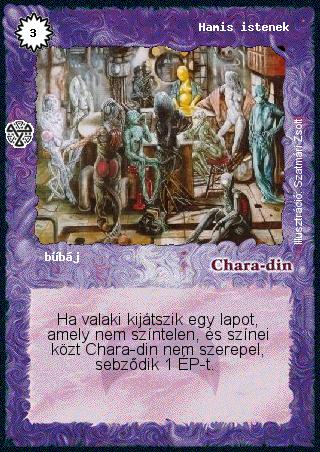 Szöveg: Ha valaki kijátszik egy lapot, amely nem színtelen, és színei közt Chara-din nem szerepel, sebződik 1 ÉP-t.