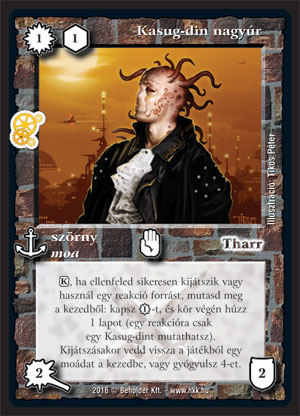 Szöveg: (K), ha ellenfeled sikeresen kijátszik vagy használ egy reakció forrást, mutasd meg a kezedből: kapsz 1_VP-t, és kör végén húzz 1 lapot (egy reakcióra csak egy Kasug-dint mutathatsz). Kijátszásakor vedd vissza a játékból egy moádat a kezedbe, vagy gyógyulsz 4-et.