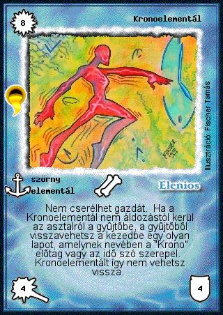 Szöveg: Nem cserélhet gazdát. Ha a Kronoelementál nem áldozástól kerül az asztalról a gyűjtőbe, a gyűjtőből visszavehetsz a kezedbe egy olyan lapot, amelynek nevében a "Krono" előtag vagy az idő szó szerepel. Kronoelementált így nem vehetsz vissza.