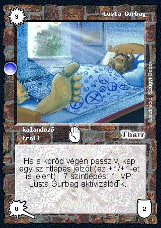 Szöveg: Ha a köröd végén passzív, kap egy szintlépés jelzőt (ez +1/+1-et is jelent). 7 szintlépés: 1 VP: Lusta Gurbag aktivizálódik.