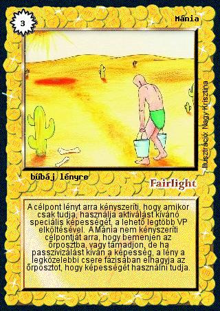 | (AK13) Ha Mánia van Morganon és az ellenfélnek nincs lénye, akkor Morgan a lényeidet, esetleg saját magát öli meg, mindig elköltve az összes VP-det. | | (AK55) A Kronobogár képessége a következő: áldozd fel 1 ÉP-det: a Kronobogár gyógyul 1 ÉP-t. Miután sebesületlen lényen is lehet gyógyítani (ld. Az istenek könnye + Haarkon kegyence kombó), ezért a végeredmény az, hogy ha sikeresen kijátszottam a bogárra a Mániát, megnyertem a játékot, az ellenfelem már nem tehet semmit. | | (AK55) Ha a Vízelementálra Mániát raksz, akkor az ellenfélnek azonnal (a reakció varázslatok és hatások után) használnia kell az elementál képességét, majd te következel, az ellenfél ismét úszni tanít, megint te jössz stb. Az ellenfél csak akkor cselekedhet mást, ha már nincs varázspontja a Vízelementál képességére. Ráadásul ez az ő körében is lezajlik, a fő fázisában ez lesz az első cselekedete. Vagyis elérheted vele azt, hogy az ellenfélnek soha többet nem lesz varázspontja. A Kronobogár képessége a következő: áldozd fel 1 ÉP-det: a Kronobogár gyógyul 1 ÉP-t. Miután sebesületlen lényen is lehet gyógyítani (ld. Az istenek könnye + Haarkon kegyence kombó), ezért a végeredmény az, hogy ha sikeresen kijátszottam a bogárra a Mániát, megnyertem a játékot, az ellenfelem már nem tehet semmit. |