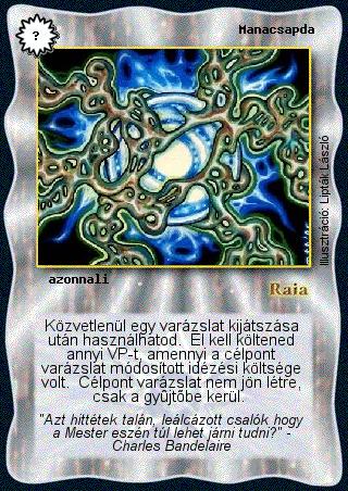 | (AK18) Az azonnali reakció varázslatok előbb létrejönnek mint az a varázslat amire reagálnak (ld. Ellenvarázslat, Manacsapda). Tehát ha a Déja vumet, vagy a Tudati vitalizációmat manaégetik, akkor először végrehajtódik a Manaégés, azután gyógyulsz a vitalizációtól vagy jön a Déja vu. | | (AK19) A Destabilizátor azokra az azonnali varázslatokra hat, melyek szövegében szerepel a "közvetlenül azután játszhatod ki" szöveg (Az elme fölénye, Ellenvarázslat, Manacsapda, Agybénítás, Manaégés, Dornodon visszavág, Rughar dilemmája, Ő a kegyencem, Azt mondtam, nem (ultraritka)), melyeket közvetlenül az ellenfél húzási fázisa után is ki lehet játszani (Passzivitás, Tudatrombolás, Elzárás), valamint A gyenge erejére és a Negációra, ha ez utóbbi kettőt reakcióként használják. | | (AK2) Egy lap idézési költségének a bal felső sarokba írt számot kell tekinteni, de ha a szöveg alapján - a hatás erősségétől függően - további VP-t kell még költeni, ez szintén beletartozik az idézési költségbe. Pl. az Azonnali gyógyítás és Jégcsóva idézési költsége nem 2, hanem 2 plusz annyi, amennyi VP-t pluszban elköltünk. Ez főként a Manaégésnél és a Manacsapdánál lehet fontos. Ha egy lap csökkenti az idézési költséget (Zan-indukátor) vagy növeli (Agyzavarás) akkor az így módosított idézési költséget kell figyelembe venni. | | (AK2) Ha célpont varázslat szörnykomponensből jön ki (pl. Megvesztegetés), akkor is lehet manacsapdázni. Ekkor a Manacsapda költsége annyi VP, ahány szörnykomponens volt az eredeti varázslat költsége. | | (AK23) A Földanya amulettjével az azonnali reakció lapokat lehet eldobatni. A harmadik kiadástól kezdve lettek megkülönböztetve az azonnali reakció lapok, így ebben a kiadásban már az Agybénításra, Manacsapdára, Az elme fölényére, a Jellemtükörre és a Manaégésre rákerült az, hogy azonnali reakció. Rajtuk kívül azonnali reakció még a Dornodon visszavág (itt nem szerepel ugyan a lapon, de a Chara-din visszatér megjelenésekor még nem volt ilyen varázslatkategória), az Ő a kegyencem és az Azt mondtam, nem. A gyenge ereje és a Negáció csak akkor változik reakció lappá, amikor kijátszásra kerülnek, ezek nem azonnali reakció lapok, tehát nem lehet őket eldobatni. | | (AK37) Reakció lapok: Ha az ellenfelem kijátszik egy Sötét halált, én ellenvarázsolom, ő feláldozza Maigner Lopotomosát és hatástalanítja az én ellenvarázslatomat, akkor én még ellenvarázsolhatom az eredeti Sötét halált. Ilyenkor még bármilyen reakciólapot ki lehet játszani az eredeti varázslatra. Sőt, a következő trükk is működik: Az ellenfél Sötét halálját ellenvarázsolom, ő agybénítja, én ismét ellenvarázsolom, ő is ellenvarázsolja, és nekem már csak 2 VP-m és Manacsapdám van, ezért az agybénítását manacsapdázom. | | (AK37) Ha az ellenfelem kijátszik egy Sötét halált, én ellenvarázsolom, ő feláldozza Maigner Lopotomosát és hatástalanítja az én Ellenvarázslatomat, akkor én még ellenvarázsolhatom az eredeti Sötét halált. Ilyenkor még bármilyen reakciólapot ki lehet játszani az eredeti varázslatra. Sőt a következő trükk is működik: Az ellenfél Sötét halálját ellenvarázsolom, ő agybénítja, én ismét ellenvarázsolom, ő is ellenvarázsolja, és nekem már csak 2 VP-m és Manacsapdám van, ezért az Agybénítását manacsapdázom. | | (AK4) Megkülönböztetünk alap és módosított idézési költséget. Egy lapnak az alap idézési költsége az a szám, amely a bal felső sarkába van írva. Amennyiben itt ? vagy X szerepel, illetve a kártya szövege szerint a bal felső sarokba írt számon kívül még további VP-t kell elkölteni, akkor az alap idézési költség a megfelelő behelyettesített érték. Ha a lap nincs játékban (a gyűjtőben, a pakliban, vagy a kézben van), akkor az X-et illetve a pluszban költendő VP-t nullának kell számolni. A ?-nél pedig a lehető legkisebb érték (pl. Tolvajszemnél 1). A módosított idézési költség az alap idézési költségnek játékban levő lapokkal módosított értéke. Ilyen lap lehet pl. egy templom, A béke erdeje, Agyzavarás. A legtöbb idézési költséget említő lap az alap idézési költségre vonatkozik. Néhány kivétel van, mint például a Manacsapda: ha mondjuk kint van egy Sheran temploma, és valaki kijátszik egy Tűzesőt 7+1 VP-ért, a Manacsapdára a módosított idézési költséget (8-at) kell elkölteni, és a templom miatt a Manacsapda idézési költsége eggyel nagyobb, tehát összesen 9-be fog kerülni. Példa az alap idézési költségre: kint van egy Zan-indukátor, kezemben van egy Azonnali gyógyítás. Amíg az Azonnali gyógyítás a kezemben van, addig az alap idézési költsége 2. Kijátszom, gyógyítok 3 ÉP-t, tehát 5 VP-t kell költenem: a kijátszás pillanatában tehát az Azonnali gyógyításom alap idézési költsége 5. A Zan-indukátor miatt eggyel kevesebb VP-t kell költenem, tehát a módosított idézési költség 4. (Figyelem: a Zöldellő fa az idézési költséget nem befolyásolja, csak a varázslat hatását!) | | (AK5) és (AK15) Ha Zöldellő fád van játékban, minden, gyógyító varázslatra költött VP-d duplán számít. Tehát egy 4-et gyógyító azonnali gyógyítás 3 VP-be kerül, egy Hódolat Raiának 2 VP-be kerül stb. Ilyenkor ezt a kevesebb VP-t kell a módosított idézési költségnek tekinteni, tehát a Manacsapdázása is fele VP-be kerül. | | (AK62) Öt varázspontért Manacsapdázhatom a Megszakítást akkor is, ha lapot dobott hozzá az ellenfél, mivel a Megszakítás idézési költsége ennyi. | | (AK63) A Lélekcsapda, a Manacsapdához hasonlóan, a módosított idézési költségre vonatkozik. | | (AK64) Az ellenállás megtörését játszom ki, amire az ellenfél Agybénítással reagá