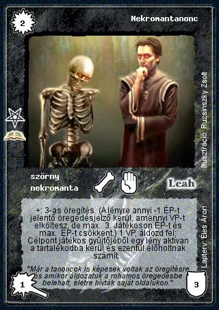 Szöveg: +: 3-as öregítés. (A lényre annyi -1 ÉP-t jelentő öregedésjelző kerül, amennyi VP-t elköltesz, de max. 3. Játékoson ÉP-t és max. ÉP-t csökkent.) 1 VP, áldozd fel: Célpont játékos gyűjtőjéből egy lény aktívan a tartalékodba kerül és ezentúl élőholtnak számít.