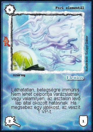 Kiadás: Alanori Krónika, Túlélők Földje Gyakoriság: ritka Lapszín (isten): Elenios Típus: szörny Szöveg: Láthatatlan, betegségre immúnis. Nem lehet célpontja varázslatnak, vagy valamilyen, az asztalon levő lap által okozott hatásnak. Ha megsebez egy játékost, az veszít 1 VP-t. Illusztráció: