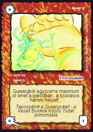 Hatalom Kártyái kártyalap - Quwarg| (AK11) Miután a Destabilizátor nem hozta meg a rengeteg ellenvarázslat ellenszerét, ezért ezentúl a Quwargokhoz hasonlóan ebből is öt lehet a pakliban. Ez a versenyekre is érvényes. | | (AK20) Ha az ellenfelem kijátszik egy Quwargot, és húzni akar a Káoszhordával, nincs lehetőségem a kijátszás és a húzás között reagálni. A Káoszhorda húzása nem külön cselekvés, hanem úgy kell tekinteni, hogy ha akarod, 2 VP-vel drágábban játszhatod ki a lényeidet, és ilyenkor húzhatsz egy lapot. | | (AK27) Alapesetben a Quwarg harcost nem öli meg A halál csókja, mivel 1/2-es lény. Ha van rajta egy Óriáserő, akkor belehalna, de az a képessége, hogy quwargokat lehet áldozni neki, életmentő hatás, tehát így életben lehet tartani. Téves az a felfogás, miszerint ha egy quwargot beáldozok a harcosnak, akkor kap +2/+1-et, tehát a sebzése is nő, ezért így nem lehet megmenteni. Ilyenkor ugyanis először sebez A halál csókja, csak utána áldozom a quwargokat, azaz a harcos így megnövelt sebzése már nem növeli A halál csókjának sebzését. Ha azonban az Óriáserő helyett egy Quwarg bolyom van játékban, akkor nem csak a harcos, hanem a kis Quwargok is belehalnak A halál csókjába, tehát nem lehet őket feláldozni a harcos megmentésére. | | (AK3) A Quwarg az ellenfél lényét támadja, a Quwarg harcos átüt az őrposzton. A Quwargot, mielőtt a tényleges sebzés megtörténne, a gyűjtőbe dobhatom, megnövelve a Quwarg harcos sebzését. | | (AK3) Ha a Quwarg harcosom halálos sebzést kap, még eldobhatok egy Quwargot, hogy megnöveljem az ÉP-jét, és ezzel megmentsem. A szabálykönyv definíciója szerint ilyenkor még játszható ki olyan hatás vagy lap, amely a lény ÉP-jét növeli. | | (AK3) Igaz, hogy sokan Quwarg kártyát használnak Quwarg jelzőnek, de az még attól jelző marad, és nem marad a gyűjtőben. A Quwarg királynő által előállított jelzőket a gyűjtőbe lehet dobni a Quwarg harcos erősítésére, de nem tápolják az Élőholt quwargot. | | (AK37) Ha Kisebb Zannal másolok egy Quwargot, akkor azt feláldozva kihozhatom belőle az Óriásférget. Először megállapítom, hogy teljesül az Óriásféreg kijátszási feltétele, mert van zanom a játékban, ezután kijátszom a férget, és a gyűjtőbe dobom a Quwarggá alakult Kisebb Zant. | | (AK43) Idegen tollakkal egy Quwargnak átadom az Illúziósárkány speciális képességeit és hátrányait. Mivel mindkét lapon a kör vége szerepel, ezért a HKK alapszabályát követjük, mely szerint a kör végén a hatások elmúlásának sorrendjét az a játékos dönti el, akinek a köre van. | | (AK45) Játékban van egy Iszonyat, egy Pozitív létsík, egy Quwarg és egy Teológia. Mivel a Quwarg nem eshet le a sík miatt, ezért a Teológia a gyűjtőbe kerül. | | (AK65) A Megtestesülés képességeit és hátrányait Idegen tollakkal átadom egy Quwargnak. Nem sebződöm akkor, amikor a Quwarg a kör végén a gyűjtőbe kerül, ugyanis a Quwarg a következő képességeket és hátrányokat kapja: "Kijátszási feltétele, hogy feláldozd X ÉP-d. Ha a Megtestesülés (vagyis jelen esetben a Quwarg) a játékból a gyűjtőbe kerül, sebződsz X ÉP-t." Miután a Quwarg kijátszásakor 0 ÉP-t áldoztam, ezért nem is sebződök a gyűjtőbe kerülésekor. | | A szabály módosult, lásd AK99-nél.
