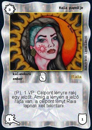 Szöveg: (P), 1 VP: Célpont lényre rakj egy jelzőt. Amíg a lényen a jelző rajta van, a célpont lényt Raia lapnak kell tekinteni.