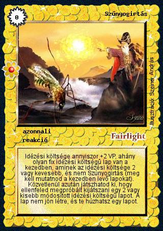 Szöveg: Idézési költsége annyiszor +2 VP, ahány olyan fix idézési költségű lap van a kezedben, aminek az idézési költsége 2 vagy kevesebb, és nem Szúnyogirtás (meg kell mutatnod a kezedben levő lapokat). Közvetlenül azután játszhatod ki, hogy ellenfeled megpróbált kijátszani egy 2 vagy kisebb módosított idézési költségű lapot. A lap nem jön létre, és te húzhatsz egy lapot.