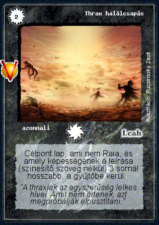 | (AK139) Nem szedi le a Thrax halálcsapás azt a kétszínű lapot, aminek az egyik színe Raia, mivel a kétszínű lapok egyszerre mindkét színűnek számítanak, és a Thrax halálcsapás nem hat Raia lapokra.