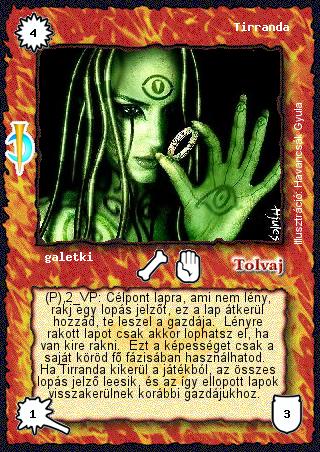Szöveg: (P),2 VP: Célpont lapra, ami nem lény, rakj egy lopás jelzőt, ez a lap átkerül hozzád, te leszel a gazdája. Lényre rakott lapot csak akkor lophatsz el, ha van kire rakni. Ezt a képességet csak a saját köröd fő fázisában használhatod. Ha Tirranda kikerül a játékból, az összes lopás jelző leesik, és az így ellopott lapok visszakerülnek korábbi gazdájukhoz.
