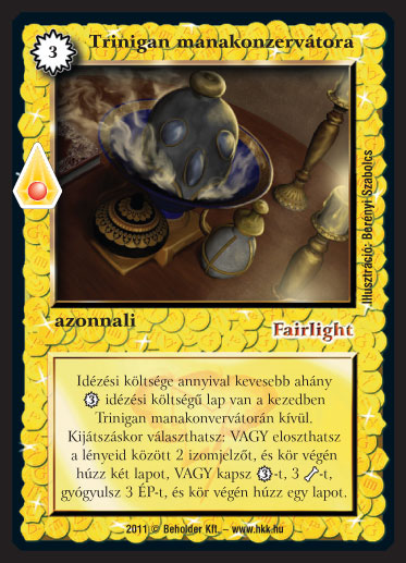 Szöveg: Idézési költsége annyival kevesebb ahány 3_VP idézési költségű lap van a kezedben Trinigan manakonvervátorán kívül. Kijátszáskor választhatsz: VAGY eloszthatsz a lényeid között 2 izomjelzőt, és kör végén húzz két lapot, VAGY kapsz 3_VP-t, 3 _*-t, gyógyulsz 3 ÉP-t, és kör végén húzz egy lapot.