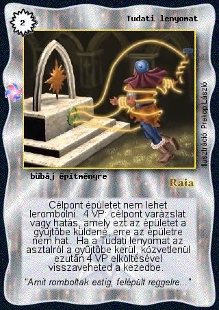 Szöveg: Célpont épületet nem lehet lerombolni. 4 VP: célpont varázslat vagy hatás, amely ezt az épületet a gyűjtőbe küldené, erre az épületre nem hat. Ha a Tudati lenyomat az asztalról a gyűjtőbe kerül, közvetlenül ezután 4 VP elköltésével visszaveheted a kezedbe.