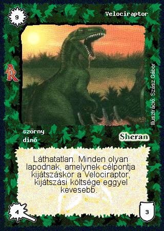Kiadás: Alanori Krónika Gyakoriság: ritka Lapszín (isten): Sheran Típus: szörny Altípus: dinó Szöveg: Láthatatlan. Minden olyan lapodnak, amelynek célpontja kijátszáskor a Velociraptor, kijátszási költsége eggyel kevesebb. Illusztráció: Szász Gábor
