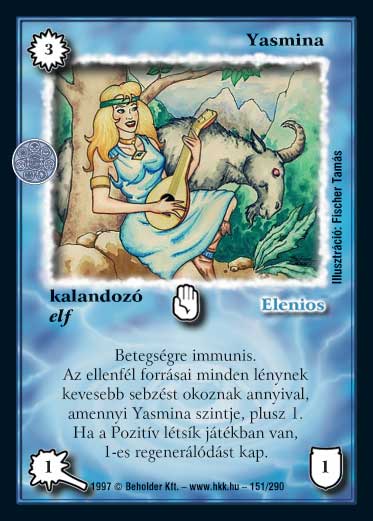 Szöveg: Betegségre immúnis. Az ellenfél minden varázslata vagy hatása, amely egy vagy több lényt megsebez, eggyel kevesebb sebzést okoz minden lénynek, plusz annyival, ahányadik szintű Yasmina (ez a képesség passzívan is működik. ) Ha a Pozitív Létsík játékban van, 1-es regenerálódást kap.