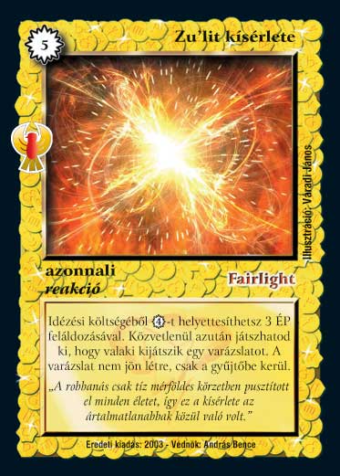 Szöveg: Idézési költségéből 4 VP-t helyettesíthetsz 3 ÉP feláldozásával. Közvetlenül azután játszhatod ki, hogy valaki kijátszik egy varázslatot. A varázslat nem jön létre, csak a gyűjtőbe kerül.