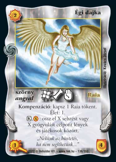 Szöveg: Kompenzáció: kapsz 1 Raia tókent. Élet: 1. (1): célpont lény vagy játékos sebződik vagy gyógyul 1-et.