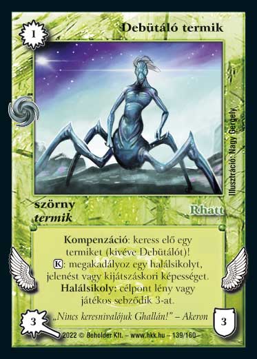 Szöveg: Kompenzáció: keress elő egy termiket (kivéve Debütálót)! (K): megakadályoz egy halálsikolyt, jelenést vagy kijátszáskori képességet. Halálsikoly: célpont lény vagy játékos sebződik 3-at.