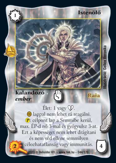 Szöveg: Élet: 1 vagy _életkioltó. _isteni lappal nem lehet rá reagálni. (P): célpont lap a Semmibe kerül, max. ÉP-d nő 3-mal és gyógyulsz 3-at. Ezt a képességet nem lehet drágítani és nem véd ellene semmilyen célozhatatlanság vagy immunitás.