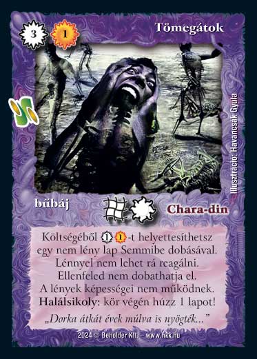 Szöveg: Költségéből 1(1)-t helyettesíthetsz egy nem lény lap Semmibe dobásával. Lénnyel nem lehet rá reagálni. Ellenfeled nem dobathatja el. A lények képességei nem működnek. Halálsikoly: kör végén húzz 1 lapot!