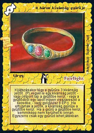 Szöveg: Kijátszásakor tégy a gyűrűre 3 kívánság jelzőt. (P),vegyél le egy kívánság jelzőt: - vagy célpont lap a gyűjtőbe kerül, - vagy a gyűjtődből egy lapot ingyen visszaveszel a kezedbe, - vagy gyógyulsz 8 ÉP-t. Ha elfogynak a jelzők, a kívánság gyűrűje a gyűjtőbe kerül. Ha a gyűrű a gyűjtőbe kerül, semmiképp nem kerülhet ki onnan. Egyszerre csak egy gyűrűd lehet játékban.