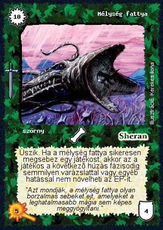 Szöveg: Úszik. Ha a mélység fattya sikeresen megsebez egy játékost, akkor az a játékos a következő húzás fázisodig semmilyen varázslattal vagy egyéb hatással nem növelheti az ÉP-it.
