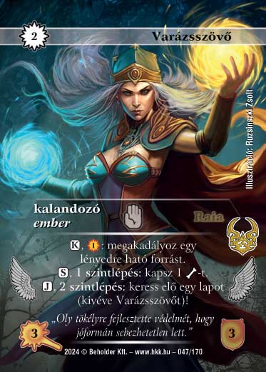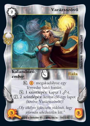 Szöveg: (K), (1): megakadályoz egy lényedre ható forrást. (S), 1 szintlépés: kapsz 1 _*-t. (J), 2 szintlépés: keress elő egy lapot(kivéve Varázsszövőt)!