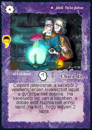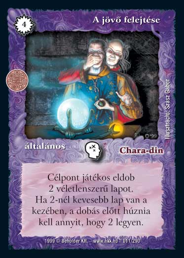 Szöveg: Célpont játékosnak a kezéből 2 véletlenszerűen kiválasztott lapját a gyűjtőbe kell dobnia. Ha kevesebb lap van a kezében, a dobás előtt húznia kell annyi lapot (ha tud), hogy legyen 2 lapja.