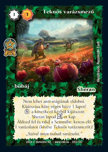 Szöveg: Nem lehet anti-mágiának eldobni. Kijátszása köre végén húzz 1 lapot! (S): a következő kézből kijátszott Sheran lapod [[1]]-et kap. Áldozd fel és rakd a Semmibe: keress elő 1 varázslatot (kivéve Teknős varázsmezőt).