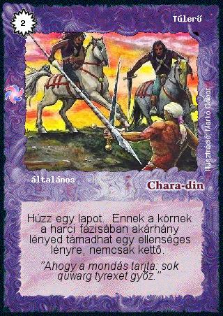 Szöveg: Húzz egy lapot. Ennek a körnek a harci fázisában akárhány lényed támadhat egy ellenséges lényre, nemcsak kettő.