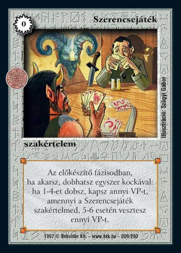 Szöveg: Minden előkészítő fázisodban, ha akarsz, dobhatsz egyszer kockával. Ha 1-4-et dobsz, kapsz annyi VP-t, amennyi a szerencsejáték szakértelmed. 5-6 esetén vesztesz ennyi VP-t.