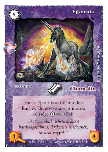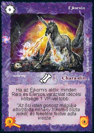 Szöveg: Ha az Éjkornis aktív, minden Raia és Elenios varázslat idézési költsége 1 VP-vel több.
