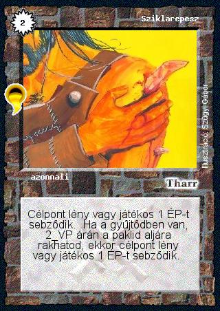 Szöveg: Célpont lény vagy játékos 1 ÉP-t sebződik. Ha a gyűjtődben van, 2 VP árán a paklid aljára rakhatod, ekkor célpont lény vagy játékos 1 ÉP-t sebződik.