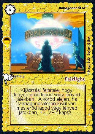 Szöveg: Kijátszási feltétele, hogy legyen,erőd lapod vagy lényed játékban. A köröd elején, ha Managenerátoron kívül van más,erőd lapod vagy lényed játékban, +2 VP-t kapsz.