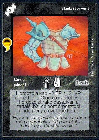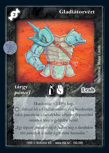 Szöveg: Hordozója kap +2 ÉP-t. 2 VP, áldozd fel a Gladiátorvértet és a hordozóját rakd passzívan a tartalékba: célpont őrposztból minden lény a gyűjtőbe kerül.