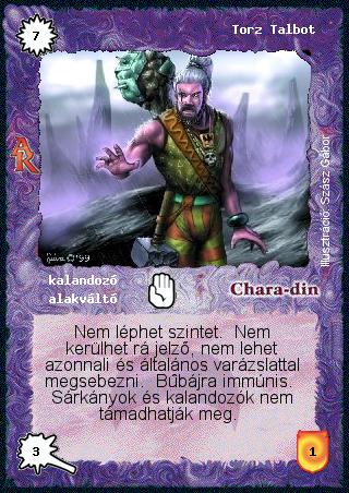 Kiadás: Alanori Krónika Gyakoriság: ritka Lapszín (isten): Chara-din Típus: kalandozó Altípus: alakváltó Szöveg: Nem léphet szintet. Nem kerülhet rá jelző, nem lehet azonnali és általános varázslattal megsebezni. Bűbájra immúnis. Sárkányok és kalandozók nem támadhatják meg. Illusztráció: Szász Gábor