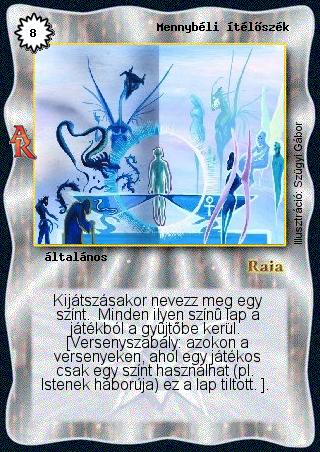 Kiadás: Alanori Krónika Gyakoriság: ritka Lapszín (isten): Raia Típus: általános Szöveg: Kijátszásakor nevezz meg egy színt. Minden ilyen színű lap a játékból a gyűjtőbe kerül. [Versenyszabály: azokon a versenyeken, ahol egy játékos csak egy színt használhat (pl. Istenek háborúja) ez a lap tiltott. ]. Illusztráció: