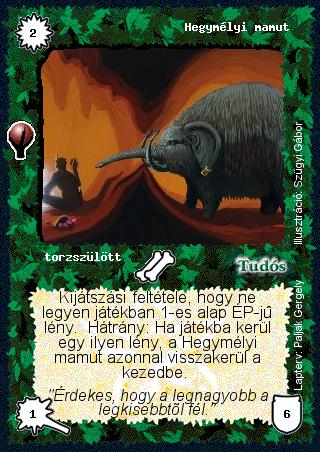 Szöveg: Kijátszási feltétele, hogy ne legyen játékban 1-es alap ÉP-jű lény. Hátrány: Ha játékba kerül egy ilyen lény, a Hegymélyi mamut azonnal visszakerül a kezedbe.