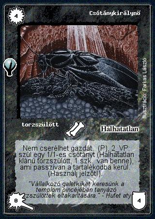 Szöveg: Nem cserélhet gazdát. (P), 2 VP: szül egy 1/1-es csótányt (Halhatatlan klánú torzszülött, 1 szk. van benne), ami passzívan a tartalékodba kerül. (Használj jelzőt!).