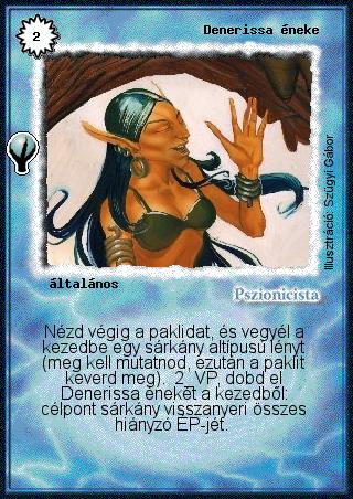 Szöveg: Nézd végig a paklidat, és vegyél a kezedbe egy sárkány altípusú lényt (meg kell mutatnod, ezután a paklit keverd meg). 2 VP, dobd el Denerissa énekét a kezedből: célpont sárkány visszanyeri összes hiányzó ÉP-jét.