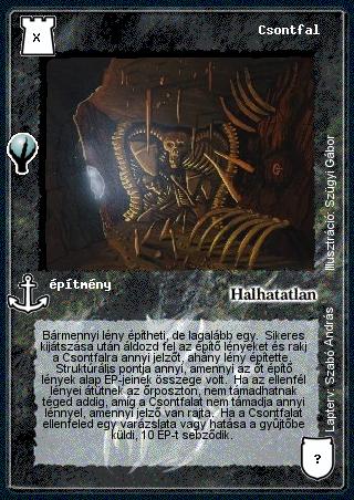 Szöveg: Bármennyi lény építheti, de lagalább egy. Sikeres kijátszása után áldozd fel az építő lényeket és rakj a Csontfalra annyi jelzőt, ahány lény építette. Struktúrális pontja annyi, amennyi az őt építő lények alap ÉP-jeinek összege volt. Ha az ellenfél lényei átütnek az őrposzton, nem támadhatnak téged addig, amíg a Csontfalat nem támadja annyi lénnyel, amennyi jelző van rajta. Ha a Csontfalat ellenfeled egy varázslata vagy hatása a gyűjtőbe küldi, 10 ÉP-t sebződik.