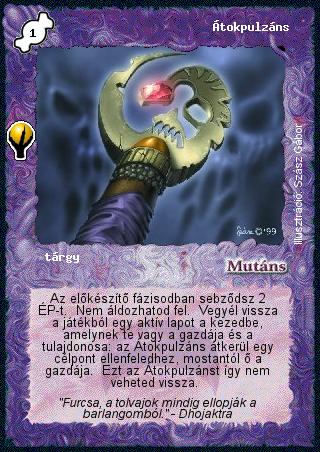 Szöveg: Az előkészítő fázisodban sebződsz 2 ÉP-t. Nem áldozhatod fel. Vegyél vissza a játékból egy aktív lapot a kezedbe, amelynek te vagy a gazdája és a tulajdonosa: az Átokpulzáns átkerül egy célpont ellenfeledhez, mostantól ő a gazdája. Ezt az Átokpulzánst így nem veheted vissza.