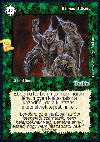 Szöveg: Ebben a körben maximum három lényt ingyen kijátszhatsz a kezedből, de a kijátszási feltételeknek teljesülni kell.