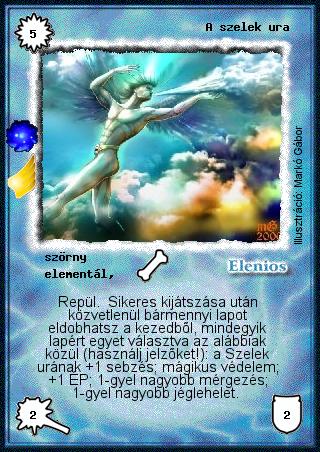 Szöveg: Repül. Sikeres kijátszása után közvetlenül bármennyi lapot eldobhatsz a kezedből, mindegyik lapért egyet választva az alábbiak közül (használj jelzőket!): a Szelek urának +1 sebzés; mágikus védelem; +1 ÉP; 1-gyel nagyobb mérgezés; 1-gyel nagyobb jéglehelet.