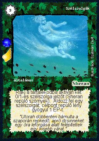Szöveg: Rakj a tartalékodba aktívan két 0/1-es szélszolga jelzőt (Sheran repülő szörnyek). Áldozz fel egy szélszolgát: célpont repülő lény gyógyul 1 ÉP-t.