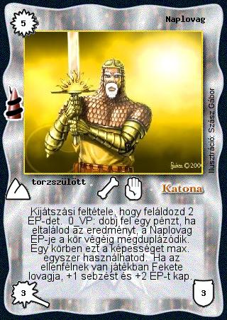 Szöveg: Kijátszási feltétele, hogy feláldozd 2 ÉP-det. 0 VP: dobj fel egy pénzt, ha eltalálod az eredményt, a Naplovag ÉP-je a kör végéig megduplázódik. Egy körben ezt a képességet max. egyszer használhatod. Ha az ellenfélnek van játékban Fekete lovagja, +1 sebzést és +2 ÉP-t kap.